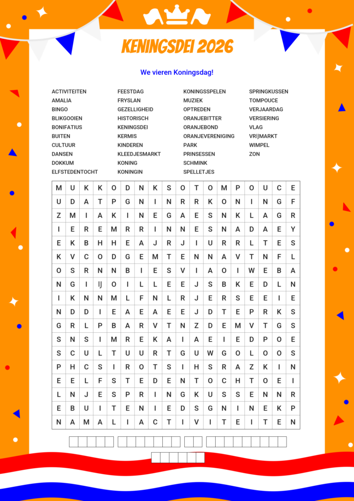 De Koninklijke Bond van Oranjeverenigingen heeft speciaal voor 2026 weer een woordzoeker gemaakt. Deze kunt u hieronder downloaden en eventueel zelf afdrukken. Veel speelplezier!
