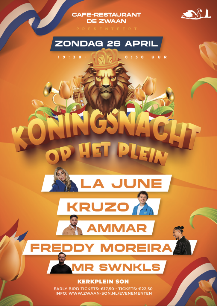 Op zaterdag 26 april 2026 organiseren Giggut Events, Foolen Audio & Light en café De Zwaan in samenwerking met het Oranjecomité een groots evenement op het Kerkplein.